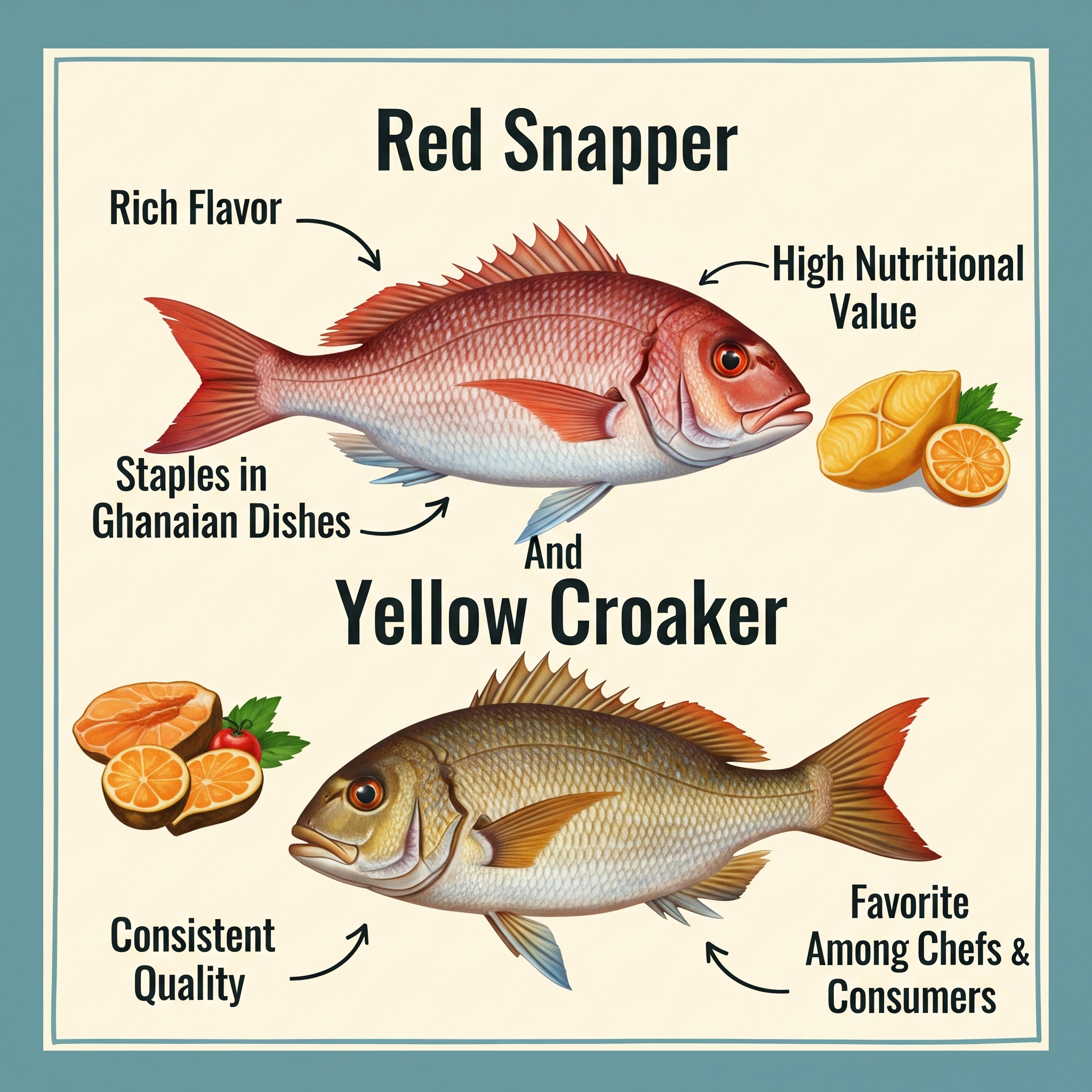 Red Snapper and Yellow Croaker are two of the most sought-after fish in the Ghanaian market, known for their rich flavor, versatility, and high nutritional value. These premium fish are staples in many Ghanaian homes and restaurants, forming the heart of beloved traditional dishes. Their consistent quality and taste make them a favorite among chefs and consumers alike. As part of our commitment to excellence, we ensure that every Red Snapper and Yellow Croaker we supply meets the highest standards of freshness and safety. Their popularity reflects not just preference, but trust in our brand and the quality we deliver.